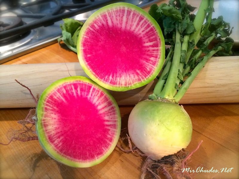 Вкус или запах тут совершенно ни при чем. Арбузный редис даже менее сочный и ароматный, нежели его распространенный собрат. Вся прелесть - в «прикиде». Это редиска шиворот-навыворот: снаружи она зеленоватая, а внутри - красно розовая с белыми прожилками.В США этот овощ стал хитом в ресторанах, но, скорее, все же из-за своих декоративных свойств. В домашней кулинарии его лучше использовать в овощном пюре или рагу.