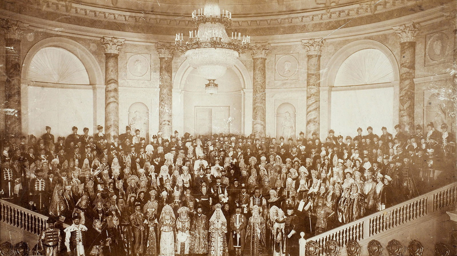 Удачная затея состояла в том, что все участники бала должны были явиться в исторических костюмах XVII века (допетровского времени), что и сделали с большим энтузиазмом. «Из частных коллекций специально для этого случая извлекли великолепные посохи, драгоценности и меха. Офицеры нарядились в мундиры того времени, а придворные оделись в платья, принятые при дворе царя Алексея. Великие княгини были одеты подобно своим прародительницам, а их наряды создавались лучшими современными мастерами... Все танцевали старинные танцы, заранее тщательно разученные, - зрелище было поистине завораживающим», - вспоминала царская фрейлина баронесса Бук-сгевден. Для того «зрелища» императрица сама выбирала исторический костюм своему мужу Ники, следуя советам директора Эрмитажа Всеволожского.