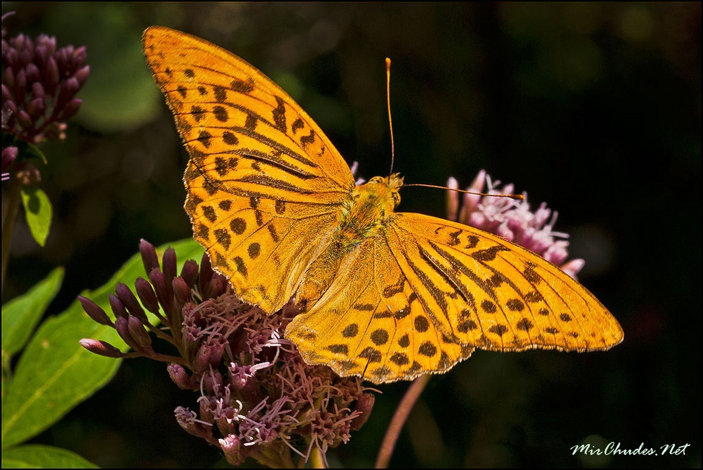 - Окраска: сверху крылья оранжево-коричневые, с многочисленными темными пятнами, нижняя сторона с серебристо-белыми полосками.