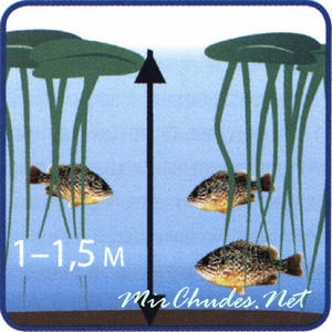 Стаи солнечных окуней любят находиться среди свай под мостками. Там всегда шныряют мелкие рыбки; можно также охотиться на червей, прицепившихся к сваям.